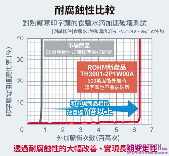 「TH3001-2P1W00A」是ROHM高精度、高速熱感寫印字頭「TH300x系列」中,印字頭的體積更為小巧(列印寬度 31.987mm)的新產品。不僅有助開發出更小、更輕便的印表機,並可以在食品包裝等狹小空間內高效列印。印字頭尺寸雖然小,但列印畫質高,而且與業界標準尺寸(列印寬度 53.312mm)的印字頭產品相比,碳帶使用成本甚至可降低至一半。另外,該系列產品不但能以1,000mm/秒以上(解析度305dpi)超高速列印,耐腐蝕性也達到普通產品的7倍以上,因此能夠延長使用壽命。對於今後需求日漸增加的環保材質來說,即使在特殊環境下,也能夠以長期高速、高畫質列印,將有助提升食品包裝、物流和品管等日期編碼資訊列印品質,並減輕環境負擔。