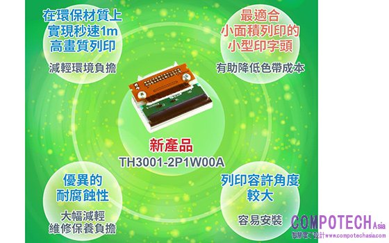 新產品「TH3001-2P1W00A」是高速高精度熱感寫印字頭「TH300x系列」中體積更小巧(31.987mm)的一款產品,有助於印表機的小型化、輕量化及高效列印,並具備了以下特點: