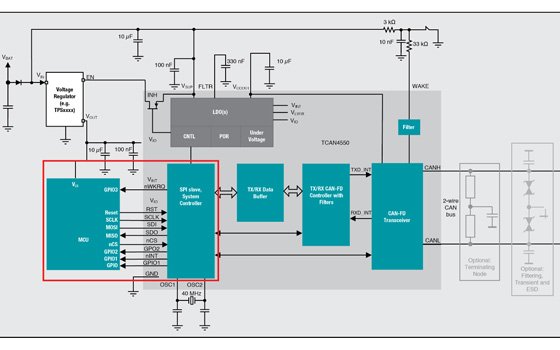 一個很恰當的SBC示例是TCAN4550-Q1,它將CAN FD控制器和收發器置於單一的封裝內。該設備藉由串列週邊介面(SPI)與微控制器和微處理器通信,在大部分處理解決方案中佔有重要地位,支持向幾乎所有的設計增添CAN FD的先進功能。圖 1是該設備及其如何連接到微處理器的基本框圖。