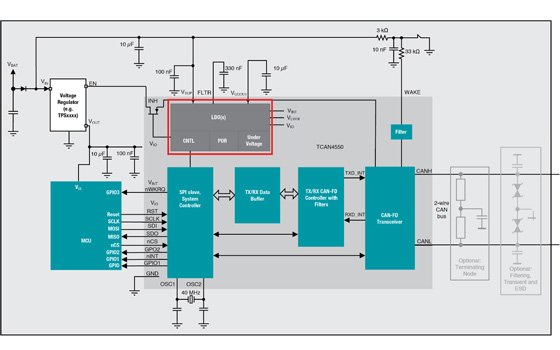 • 欲瞭解更多關於TCAN4550-Q1中的LDO功能,請參閱應用說明書“瞭解TCAN4550-Q1中的LDO性能”及應用報告。