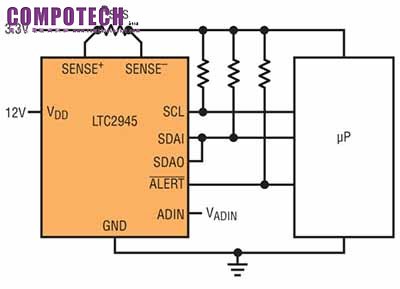 LTC2945 正積極進入許多複雜和空間受限的應用,包括 RAID 系統、電信、交通運輸、太陽能監視系統和工業電腦 / 控制系統。幸運的是:該元件只需要進行幾個簡單的連接。圖 2 所示為 LTC2945 監視一個 3.3V 微處理器的輸入電壓和電流,以及由 12V 電源供電的情況。僅需的外部元件為1個感測電阻和 3 個上拉電阻。