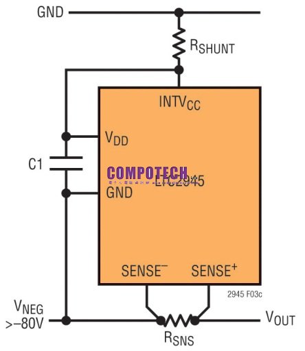圖 4b:在低端電流感測架構中,LTC2945 透過低端並聯穩壓器獲得電源