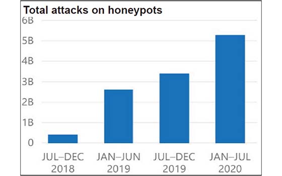 圖:2020年前7個月MSTIC在Azure雲端部署的“蜜罐”收到超過50 億次攻擊