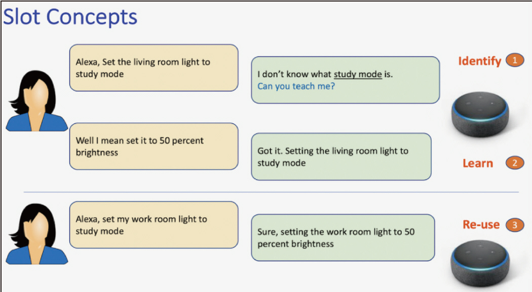 圖:Alexa 能與用戶即時互動式教學,將這些概念推廣到新的上、下文中,並將其與使用者帳戶連結