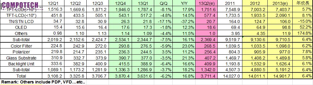 關鍵零組件之彩色濾光片產業方面,目前彩色濾光片主要產值貢獻來源為廠商內製化的產出為主,專業廠除生產彩色濾光片外,也部分轉型至Touch Sensor加工業務進行生產,預計第二季此現象仍將持續。不過專業廠在第二季仍有部分可以發揮之處,主要是因為搭配下游面板業者的高精細面板產品策略,專業廠在細線幅以及對應IPS技術的彩色濾光片的開發能力上仍優於面板廠內製,因此仍能對於專業廠的營收帶來助益。預估第二季雖無強力訂單支協助出貨衝量,但隨著高精細面板用彩色濾光片產出持續增加將可略微彌補淡季因素,進而支撐一定營收,達到新台幣268.5億元。偏光板產業方面,國內的偏光板廠將在國內LCD廠商出貨增加,特別是新尺寸的電視面板出貨增加,帶動偏光板的需求,預估2013年第二季產值將達新台幣256.4億元,季成長4.9%。玻璃基板產業方面,國內的面板廠稼動率有望提升,提高對於玻璃基板的需求,預估第二季產值將達新台幣407.2億元,季成長8.0%,較去年同期因產業仍處於谷底相較,大幅成長22.3%。2013整年度因LCD產業景氣復甦,加上各類產品的平均尺寸增加,增加玻璃基板的需求面積,抵銷單價的下滑,預估2013年產值達新台幣1,489.8億元,較2012年小幅成長5.8%。背光模組產業方面,2013年第一季因產業淡季,電視面板以及NB面板需求減緩導致產值下滑,第二季在面板出貨逐漸的增加,加上韓系背光模組廠商南京廠房大火,部分訂單移轉下,預估仍較第2013年第一季成長5.4%,達新台幣409.9億元。