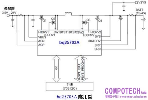 由於USB Type-C連接埠是通用的,具備很高的功率傳輸能力,是適合此類應用的理想選擇。為了使具有不同電壓和電量的電源相容,像是無人機這樣的多單元電池組系統很有必要使用降壓-升壓型充電器。在飛行間隔期間,用戶能夠快速而安全地對電池進行充電也是至關重要的。bq25703A和bq25700A支持高達6.35A的充電電流,並具有廣泛的保護功能,包括有助於從各種適配器獲得最大功率的輸入電流最佳化(ICO)。附圖為 bq25703A應用圖。