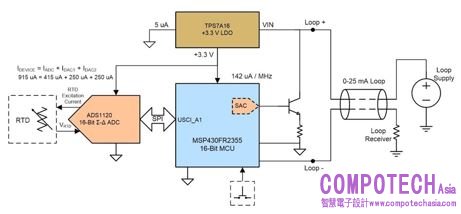 工廠的溫度傳送器是智慧類比組合和支援-40至105°C工作溫度的MSP430FR2355 MCU的其中一個感測應用。採用MSP430FR2355 MCU的4mA至20mA迴路供電的電阻溫度感測器(RTD)溫度傳送器參考設計提供了較少零組件數量、低成本的解決方案。此參考設計採用MSP430FR2355 MCU晶片內建的智慧類比組合來控制迴路電流,因此不再需要獨立式DAC,如圖2所示。