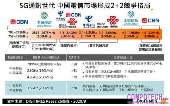 進入5G世代後,中國電信營運市場進入2+2競爭格局,中國移動與中國廣電、中國聯通與中國電信分別簽署共頻共網合作協議,以降低5G網路部署支出壓力。然合計三大營運商5G資本支出在2020年上半仍高達人民幣880億元,估計全年將逾1,800億元及338%年增率,提高業者營運壓力,但以整體中國電信(含設備)產業而言,卻也適時填補中系電信設備商因中美脫鉤衝擊其國際市佔的影響。