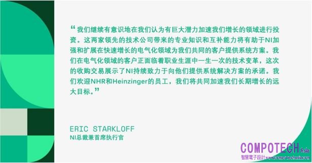 NI總裁兼首席執行官Eric Starkloff說:“我們繼續有意識地在我們認為有巨大潛力加速我們增長的領域進行投資。這兩家領先的技術公司帶來的專業知識和互補能力將有助於NI加強和擴展在快速增長的電氣化領域為我們共同的客戶提供系統方案。我們在電氣化領域的客戶正面臨著職業生涯中一生一次的技術變革,這次的收購交易展示了NI持續致力於向他們提供系統解決方案的承諾。我們歡迎NHR和Heinzinger的員工,我們將共同加速我們長期增長的遠大目標。”