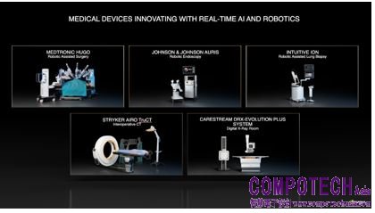 許多醫療設備公司投入 AI 和機器人技術,並將 NVIDIA 加速運算平台用於機器人手術、行動電腦斷層 (CT) 掃描、支氣管鏡檢查等應用。
