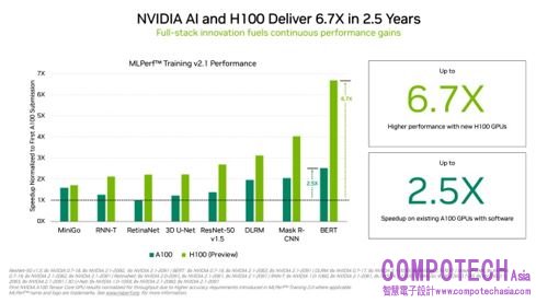 圖一_NVIDIA H100 GPU 首次提交 MLPerf 訓練成績時,速度比 A100 GPU 快 6.7 倍