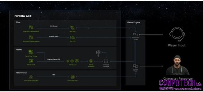 NVIDIA ACE for Games 包括用於偵測及將玩家口說內容轉成文字的 NVIDIA Riva 等人工智慧基礎模型。文字提示 NVIDIA NeMo 產生客製化回應內容,並且由 NVIDIA Omniverse Audio2Face 製作成動畫。