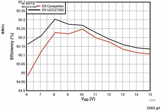 與競爭產品器件相比,UCC27282在較低的VDD範圍內工作時可以保持足夠的柵極驅動強度。這可以獲得功率轉換器效率的顯著提升。