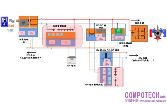 圖1:典型的帶有OBC、BMS、DC/DC、逆變器和電機控制的HEV/EV系統圖