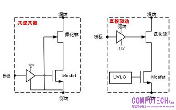 漏端和漏端之間的GaN中存在本征二維電子氣層(2-DEG),使該器件在零柵極-漏端電壓下導電。出於安全原因,沒有偏置電源時,必須關閉開關電源中使用的電源器件,以將輸入與輸出斷開。為類比增強模式器件,將低壓MOSFET與GaN源端串聯放置。圖1所示為實現此目的的兩種不同配置:共源共柵驅動和直接驅動。