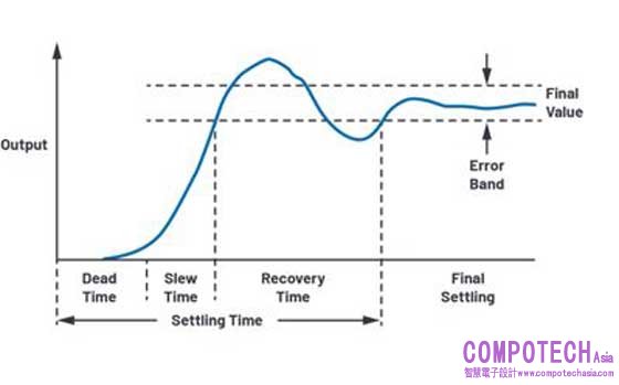 放大器或任何訊號鏈的安定時間(settling time),係指針對輸入端出現步階變化,輸出需要多少時間才能完成反應,該時間就是安定時間,且最終值會安定在預先定義的誤差帶範圍內,如圖1所示,量測到的值為輸入脈衝的50%。