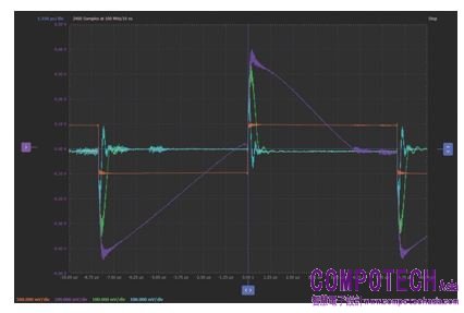 在一些案例中,在假值求和節點提高到誤差訊號位準之後,即可使用第二(極快)放大器步階。包括ADALM2000模組在內的許多現代數位化示波器,除了對輸入過度驅動比較不敏感,還能直接用來量測誤差波形。但還是得對每部示波器確認這方面的功能,仔細查閱操作手冊的說明。注意到直接量測功能,可測出反相與非反相模式中的安定時間。其中一個例子就是圖4中OP27 與OP97運算放大器中,輸出步階對平坦脈衝輸入的反應。注意到1%的安定時間,對OP27大約是2.8 微秒,對於OP97則是4.2微秒。