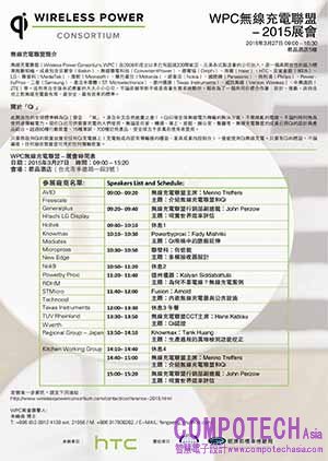 2015年3月25日--制定全球最普及之無線充電標準Qi的無線充電聯盟(WPC)即將與HTC在台北邀請台灣與國際頂尖科技公司共同參與Qi全球高峰論壇,與會者包含元件供應商、系統製造商、消費者品牌、認證實驗室和基礎建設夥伴,進行為期一周的會員會議,並於本週五展出國際與台灣會員的最新科技與應用。