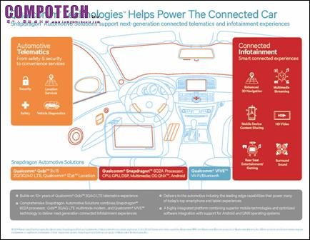 高通已為了汽車推出了多種技術和解决方案,更於今年推出首款整合性解決方案─Snapdragon™車用解决方案,包括車用級Snapdragon™處理器、Gobi™ 3G/4G LTE多模數據機和Qualcomm VIVE™ Wi-Fi及藍牙解决方案。
