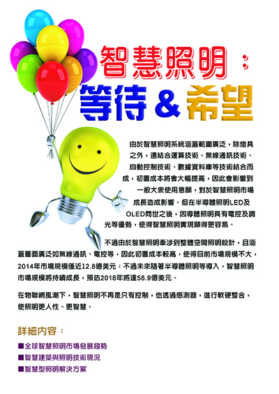 不過由於智慧照明牽涉到整體空間照明設計,且涵蓋層面廣泛如無線通訊、電控等,因此初置成本較高,使得目前市場規模不大,2014年市場規模僅近12.8億美元;不過未來隨著半導體照明等導入,智慧照明市場規模將持續成長,預估2018年將達58.9億美元。