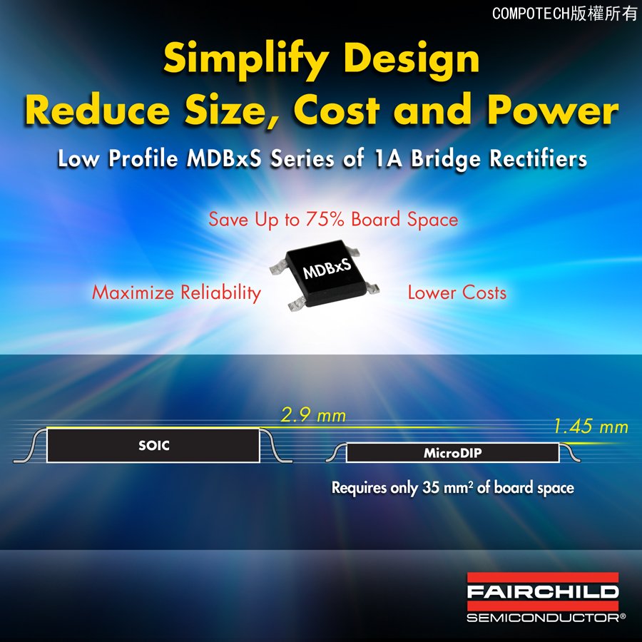 可攜式產品的設計人員時常面對縮小產品空間和簡化線路板佈局,同時提供最高可靠性和降低整體製造成本的挑戰。有鑑於此,快捷半導體(Fairchild Semiconductor) 推出MDBxS系列MicroDIP橋式整流器,幫助設計人員應對這一挑戰。MDBxS系列是現有封裝高度最低的1A橋式整流器之一。