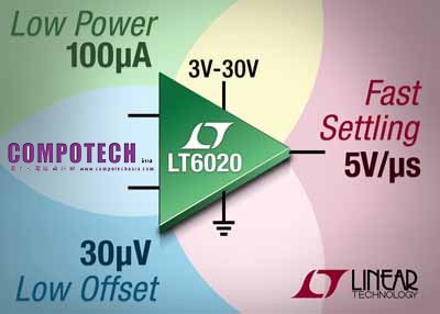 2014年4月1日 –凌力爾特 ( Linear Technology) 日前發表雙組3V至30V快速穩定運算放大器LT6020,該元件具有30µV 最大輸入補償電壓和0.5µV/°C最大VOS 漂移。每個放大器供應電流僅100µA (最大值),專利旋轉強化電路提供快速清晰的輸出步階響應。LT6020可於15µs內穩定至0.0015% 而無論輸出步階是5V或25V。特別設計的輸入電路可保持高阻抗以將快速步階之電流尖峰降至最小,以因應5V輸入步階。相關特性使LT6020非常適用於高精度多工資料採集系統、DAC緩衝應用和可攜式高精度儀器。