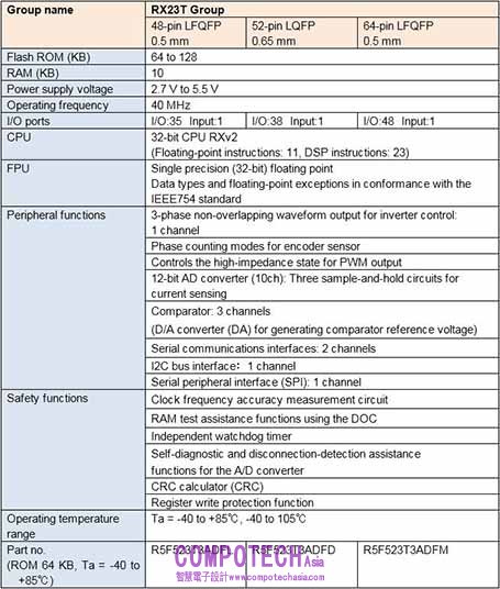 關於RX23T群組MCU之主要規格,請參閱附件。