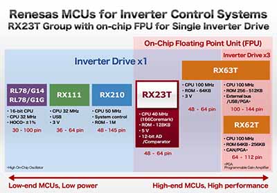 變頻器控制需要包含小數點的大量數學運算,有助於使用浮點運算單元的裝置運行。但是,中階與低價能源效率家用電器與工業設備在成本方面受到限制,因此無法採用晶片內建FPU的高價微控制器。最常見的替代方案是改採低階僅支援定點運算的軟體。新款RX23T群組MCU整合晶片內建FPU而不增加成本,因此在可省略小數點位移之程式碼。如此可簡化軟體組態,最多縮減30%的程式碼大小與開發時間。晶片內建周邊功能亦針對單一變頻器驅動器進行最佳化,大幅提升成本效能比,使中階與初階產品亦可增加高精度變頻器控制功能。
