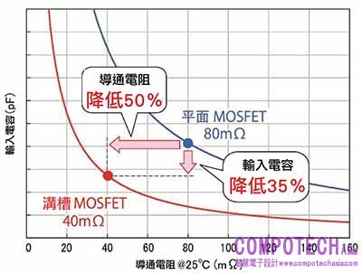 此次,ROHM通過採用獨創的結構,成功地解決了該課題,並世界首家實現了採用溝槽結構的SiC-MOSFET的量產。與已經在量產中的平面型SiC-MOSFET相比,導通電阻可降低約50%,同時還提高了開關性能(輸入電容降低約35%)。