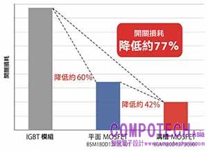與同等水準額定電流的Si-IGBT模組產品相比,其顯著優勢當然不必言說,即使與使用平面型SiC-MOSFET的“全SiC”模組相比,其開關損耗也降低了約42%。