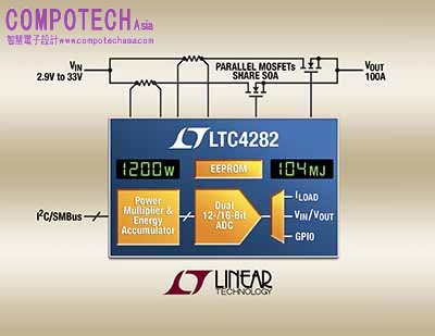 在電路板電源閘極上,LTC4282的±0.7%精度ADC(類比數位轉換器)會透過一個I2C/SMBus數位介面報告板上電壓、電流、功率及能耗。在過電流條件下,LTC4282會返折其2%精準電流限制,針對可調節的超時時間保持恆定的MOSFET的功耗。數位配置的電流限制允許當負載變化時的動態調整,並簡化對於低值感測電阻的選擇。監視電氣參數的最大值和最小值可被記錄,並在超過8位元門檻時提出警報。內部EEPROM提供針對暫存器配置和故障日誌數據的非揮發性儲存。為防止電路板的災難性破壞,MOSFET會在連續異常時持續監控,例如低閘極電壓和汲極 - 源極短路或大壓降。