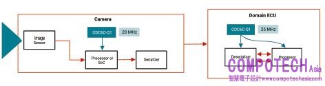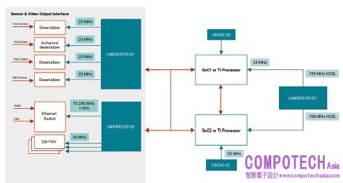图 3. 新一代架構採用 CDC6C-Q1 振盪器,支援處理器與解串器