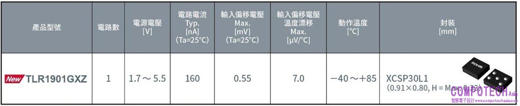 半導體製造商ROHM(總公司:日本京都市)推出工作時的電路電流可控制在業界最低水準的超小型CMOS運算放大器「TLR1901GXZ」。該產品非常適用於電池或充電電池驅動的攜帶式測量儀器、穿戴式設備和室內探測器等小型應用中的測量放大器。