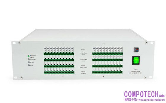 圖 1. EA-BIM 20005 電池阻抗分析儀提供了 20 個用於電化學阻抗譜 (EIS) 量測的通道,外加 20 個可用於溫度感應器的通道