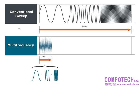 圖 2. 傳統的掃頻阻抗量測可能需要 300 秒,而先進的多頻量測技術僅需 1 秒。