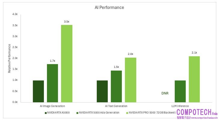 在生成式 AI 的業界標準基準測試中,RTX PRO 5000 72GB 的影像生成效能相較上一代 NVIDIA 硬體提升達 3.5 倍,文字生成效能則可提升達 2 倍。
