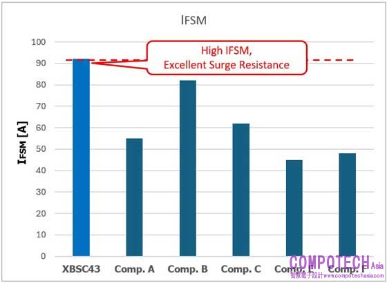 此外,本系列透過有效降低性能指標(FOM)(圖1),進一步減少功率損耗,實現高效率運作,同時大幅強化 IFSM(浪湧正向電流)(圖2)耐量。即使在產生嚴苛浪湧電流或突入電流的環境下,亦能保持穩定運作,進而提升整體系統的可靠性。