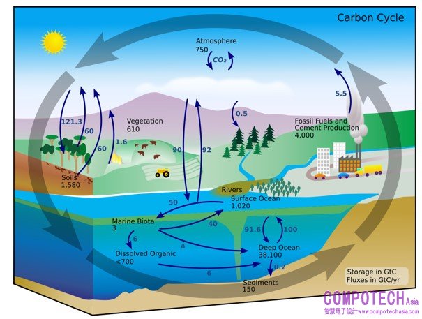 圖6:這張碳循環圖顯示了大氣圈、水圈和岩石圈之間碳的儲存量和每年交換量,單位為千兆噸(GtC),人類燃燒化石燃料每年向大氣排放約5.5 GtC的碳