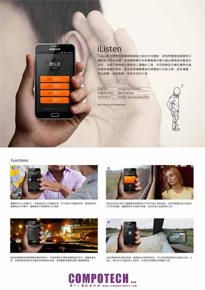 iListen 是針對聽障者所設計的智慧溝通軟體,由宏正自動科技與台灣科技大學工商業設計系協同合作完成,期望透過內建輔具軟體App的智慧型手機,將聲音轉化為文字,給予聽障者各項生活需求的即時協助,並可作為安全的警示器與翻譯機功能,以具體改善聽障者在生活溝通所遇到的不便之處。