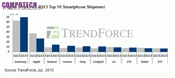 中國品牌智慧型手機廠商受惠本土強勁的內需成長,全年出貨較2012年成長44%,居全球之冠,中國品牌中又以華為、中興、聯想與酷派四家最受矚目。聯想在2012年第四季搶下中國本土品牌出貨冠軍,市占率一度快追平三星,達13.7%。到了今年第二季華為又再搶回本土品牌王座,單季出貨已達一千四百餘萬支,華為除了經營中國本地的銷售,外銷印度、東南亞以及東歐等新興市場約占三成左右的出貨比重,替華為帶來另一股穩定的成長動能,是本季名列全球出貨第三名的主因。