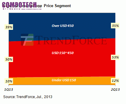 TrendForce預估,今年第三季中階智慧型手機出貨量約為一億三千萬台,季度成長8.6%,占智慧型手機總體出貨比重維持在五成以上,因此對於手機廠商來說,想要擴張品牌手機市占率,中階手機產品廝殺將是難以迴避的戰場。目前觀察到Android手機陣營如三星、SONY、hTC、LG等眾多國際知名品牌都將陸續在第三季推出多款中階機種以爭取消費者青睞,在智慧型手機越來越普及的今日,中價位產品將左右手機廠商在整體市場的市占率。