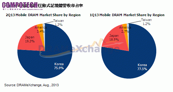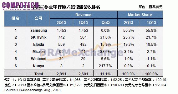 三星半導體的行動式記憶體營收市占與上季相較雖小幅下滑,仍持有超過50%以上的領導地位,原先三星所生產的行動式記憶體以供應Samsung手機部門為主,但在維持供應鏈穩固的考量之下,Samsung手機部門開始擴大對外採購零組件,向市占名列第二、第三的SK海力士及爾必達購買其行動式記憶體。對於三星半導體而言,雖然短期之內會影響市占消長,但在目前已經逼近獨占地位情況下,釋放某部分行動式記憶體產能,讓各產品線之間的調配更有彈性,為目前三星策略上的最優先考量。