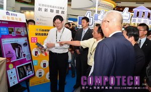 圖說:2014台北國際發明暨技術交易展於今(18)日起正式展開,圖為資策會執行長吳瑞北(左三)及資策會創研所組長邱璟明(左一)親自為副總統吳敦義(中)解說「行動購物牆」之研發成果。