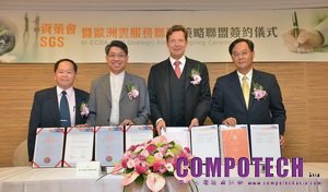 圖說:為協助國內廠商搶進國際雲端市場、接軌國際,今(22)日在經濟部工業局副組長周崇斌(左一)的見證下,分別由資策會副執行長龔仁文(左二)、SGS臺灣暨東亞地區國際驗證部副總裁黃世忠(右一)與歐洲雲服務聯盟副主席Dr. Tobias Höllwarth(右二),進行策略聯盟簽約儀式,為爭取本土雲端運算產品及服務直接取得國際驗證,進軍歐美國際市場而鋪路。