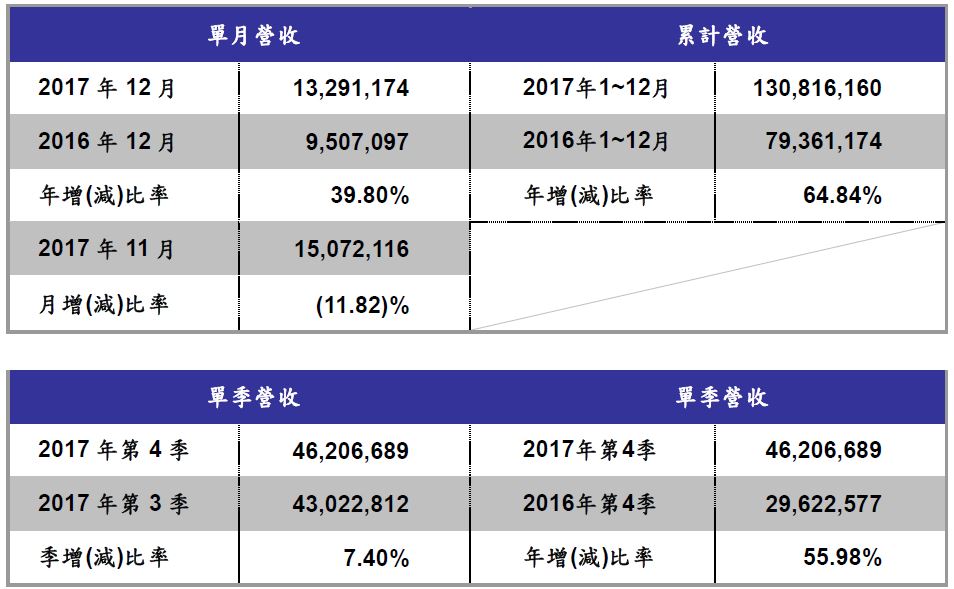 2017年12月份營收報告 (單位: 新台幣仟元)
