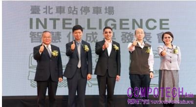 圖說:資策會與停車場業者合作,於台北車站東西區停車場,導入智慧停車服務,並於今(30)日舉行成果發表會,圖為與會貴賓合影,右起為:資策會系統所馮明惠所長、交通部路政司朱大慶科長、台鐵貨運服務總所顏文忠總經理、歐特儀黃祺良總經理、台灣銀行古兆柱經理。