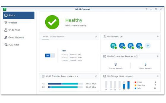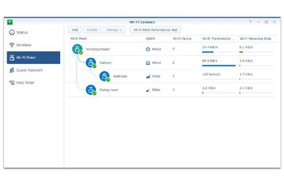 MR2200ac 搭配 Qualcomm® IPQ4019 四核心系統晶片打造三頻無線網路,將寬頻網路速度覆蓋至家中各個角落,消除網路死角。網路中所有裝置皆可透過獲得多項大獎的路由器作業系統 Synology Router Manager (SRM) 管理,讓家用消費者也能享有商業等級的網路功能。