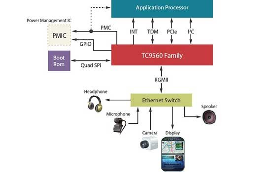 TC9560XBG連接至應用處理器或其它SoC主機後,可允許主機設備透過汽車內的10/100/1000乙太網路傳輸音訊、影像和資料