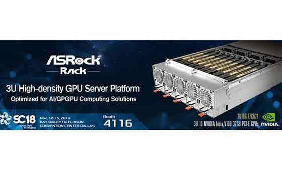 2018年11月13日--華擎科技旗下伺服器領導品牌永擎電子(ASRock Rack),今日於美國德州達拉斯參加產業年度盛會-全球超算大會(Supercomputing 2018, SC18),展出最新高效能運算、雲端伺服器平台。因應高效能運算、人工智慧、深度學習、圖形運算與大數據分析等應用需求,永擎推出支援最高10張NVIDA® Tesla® V100 32GB Tensor Core PCI-e GPU加速器之3U高密度GPU伺服器平台,以及全新搭載AMD EPYCTM 7000系列處理器之2U高速運算GPU伺服器。