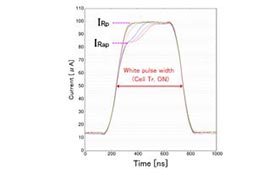 〈圖〉STT-MRAM切換電流測量實例。切換中電流變換時間〈圖中水平軸的長度是電流由IRAP轉換為IRP的時間〉隨切換操作而改變的情形。此記憶測試系統測量了分鐘差異,以每奈米秒中變化的微安培量進行測量。
